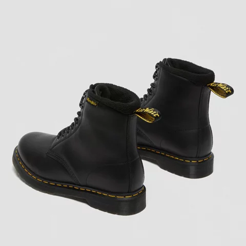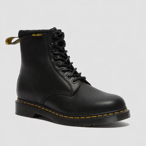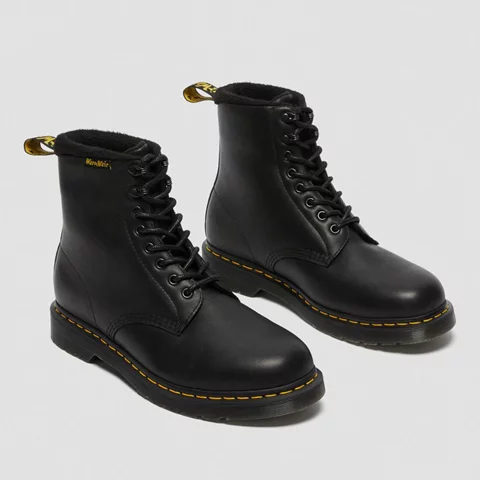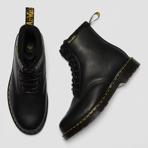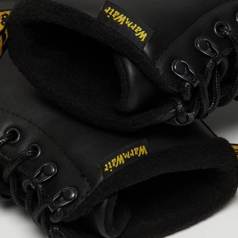 The classic DM's boot. Reimagined to take on winter. These fur-lined boots are crafted from Valor WP, a heavyweight leather with a rugged tumbled finish, and fitted with soft fleece linings and a fleece-lined sock for optimum warmth. Built for comfort, the WarmWair boots have rolled toplines and a sculpted tongue for a snug fit. They're marked with all our signature DNA, and set on a Smoke DMS sole reinforced with yellow welt stitching.