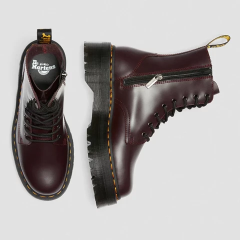 We’ve fused our 3 original colours of cherry, oxblood and black to inspire our new burgundy Smooth leather Jadon boot. As durable as ever rising tall on our elevated Quad air-cushioned sole. A punched in Goodyear yellow welt stitch and signed with our AirWair heel hoop. A piece of history built for today.