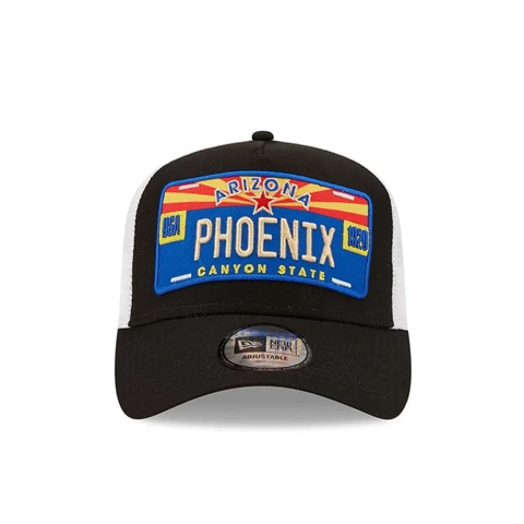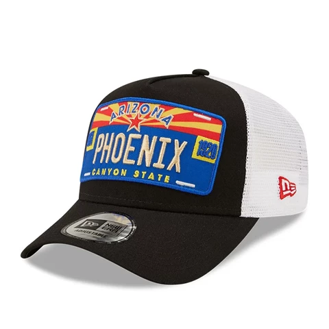 Hit the road in total style with the official New Era Licence Plate Black 9FORTY A-Frame Trucker Cap. Completed in a black and white colourway, the design boasts cooling mesh panels and a curved visor that shades the face. A Phoenix licence plate graphic features on the front of the cap and an adjustable snap closure at the rear.