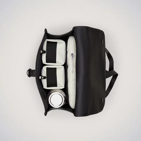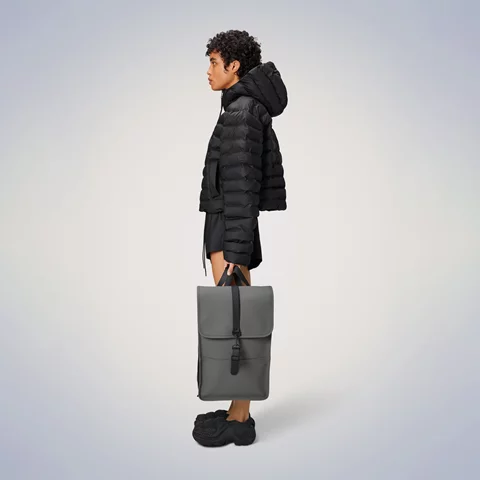 The Backpack silhouette is characterized by its prominent flap and central strap with carabiner closure. This clean and ever contemporary waterproof rucksack features an internal laptop pocket, a spacious main compartment, and a concealed external phone pocket on the back panel.