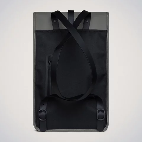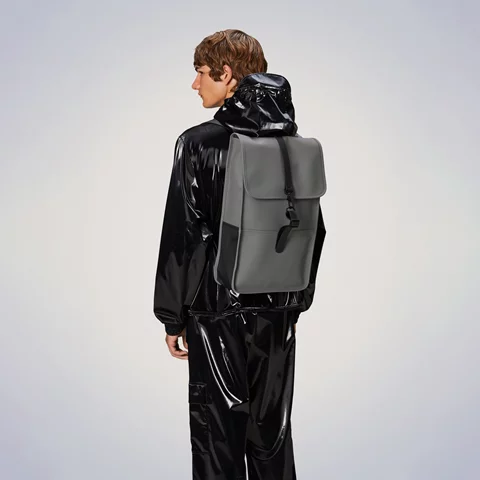 Backpack is cut in Rains’ signature waterproof PU fabric, engineered for carrying strength, durability, and a smooth feel.
