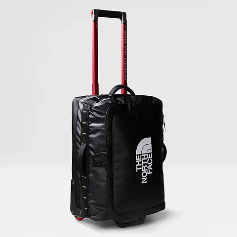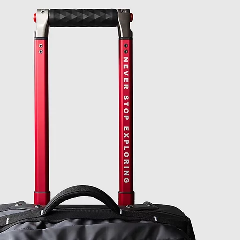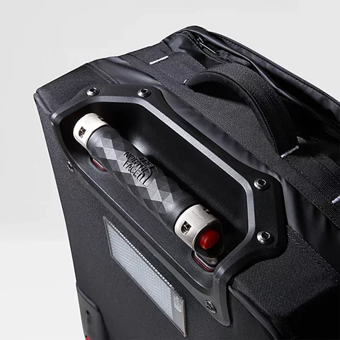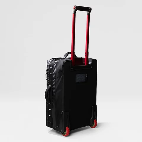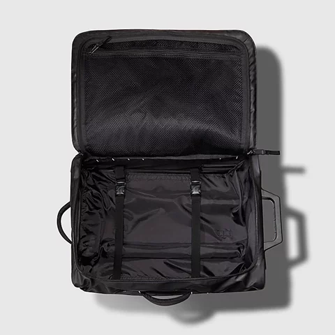 Roomy fit: This bag offers plenty of room for essentials and everyday belongings. Our iconic Base Camp Voyager Duffel is the inspiration for this new roller. Made from durable yet lightweight recycled polyester tarpaulin with a rock-solid chassis, it's built to handle a beating when being transported around the world. But it's not just tough; it's really practical, too. The two smooth-rolling wheels and the wide telescoping handle make this rolling bag comfortable when hauled through airports and around town. There's a 15" sleeve on the inside to keep your laptop safe. And the large internal compartment features a zipped divider to help keep dirty shoes or wet gear away from your clean clothes. But while there's plenty of room for travel essentials, compression straps help you find space for a little more. Not to mention there are extra pockets both inside and out for quick and easy access to your passport, phone, wallet and keys.